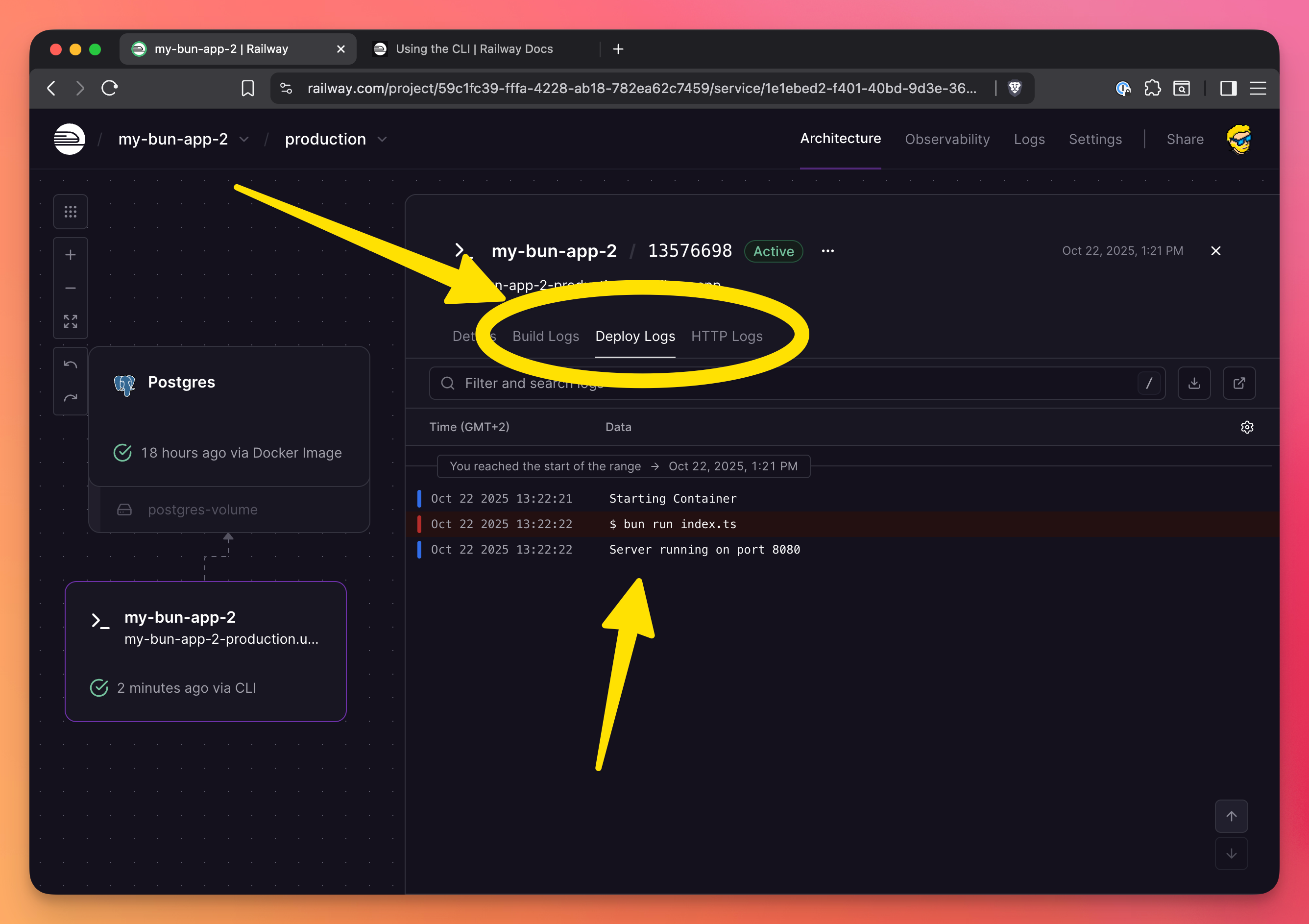 Railway provides real-time logs for every deployment. Click on any deployment to see its logs.