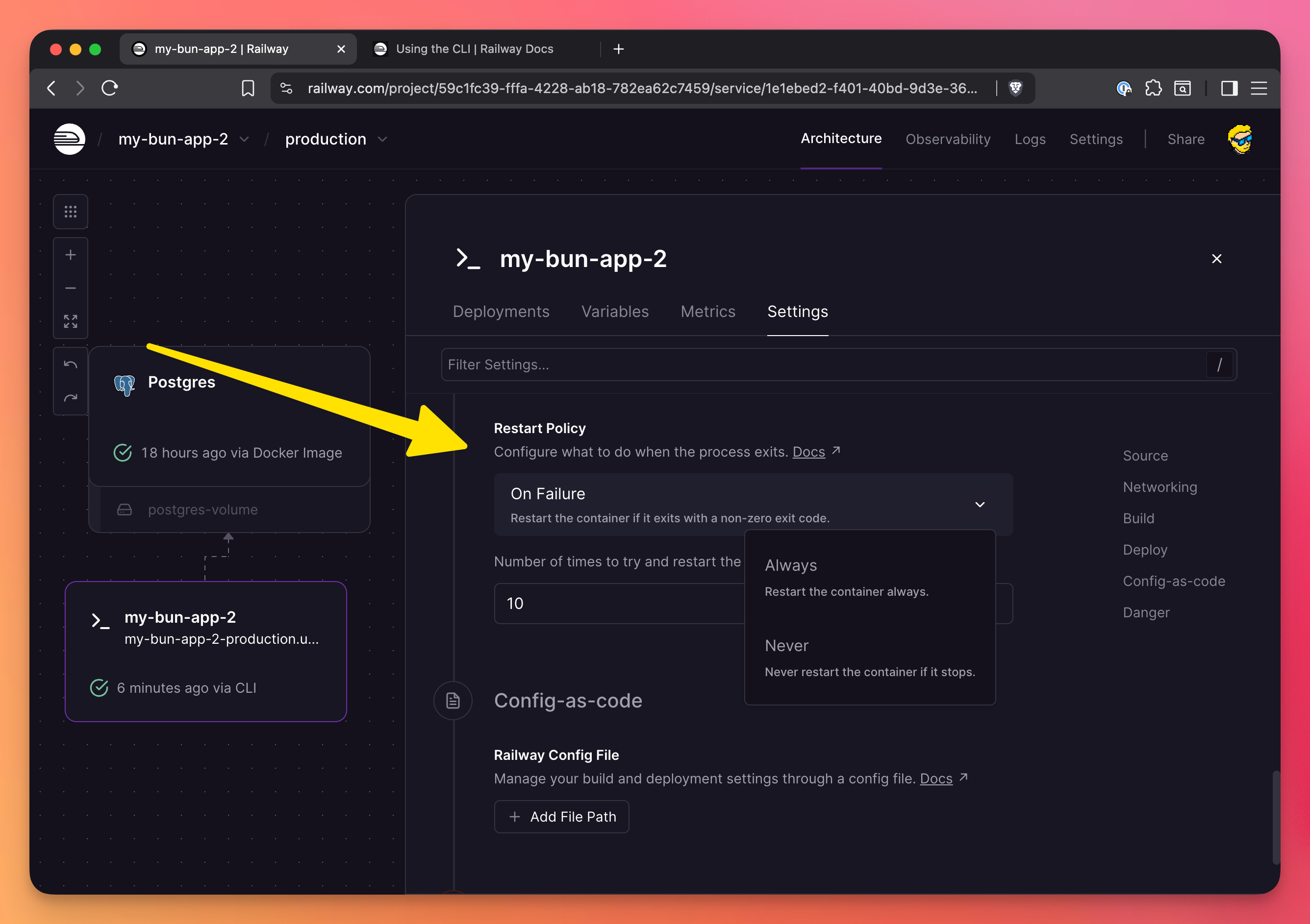 In service settings, enable “Restart Policy” to automatically restart your service if it crashes. You can set the number of times it retries before giving up: