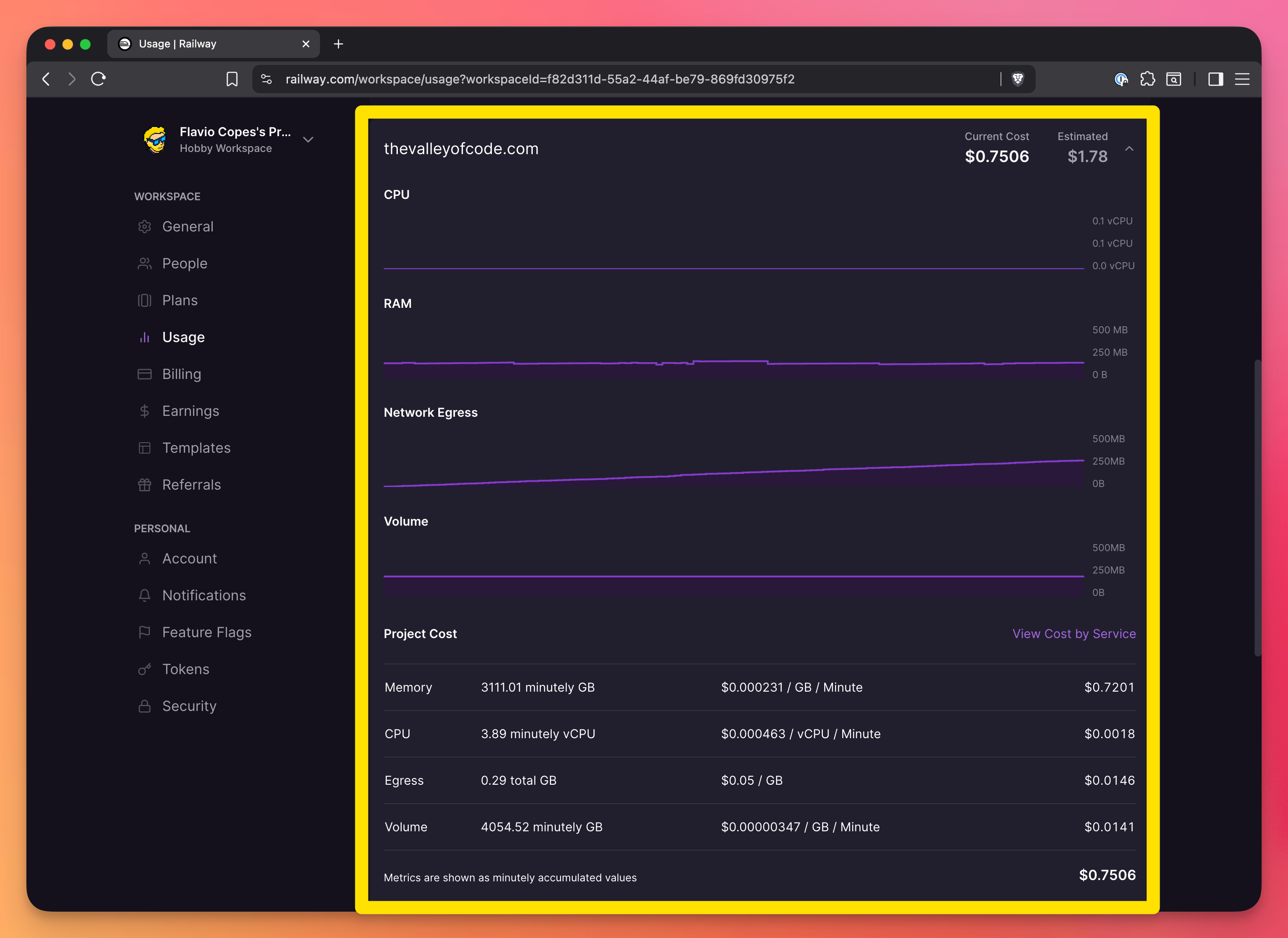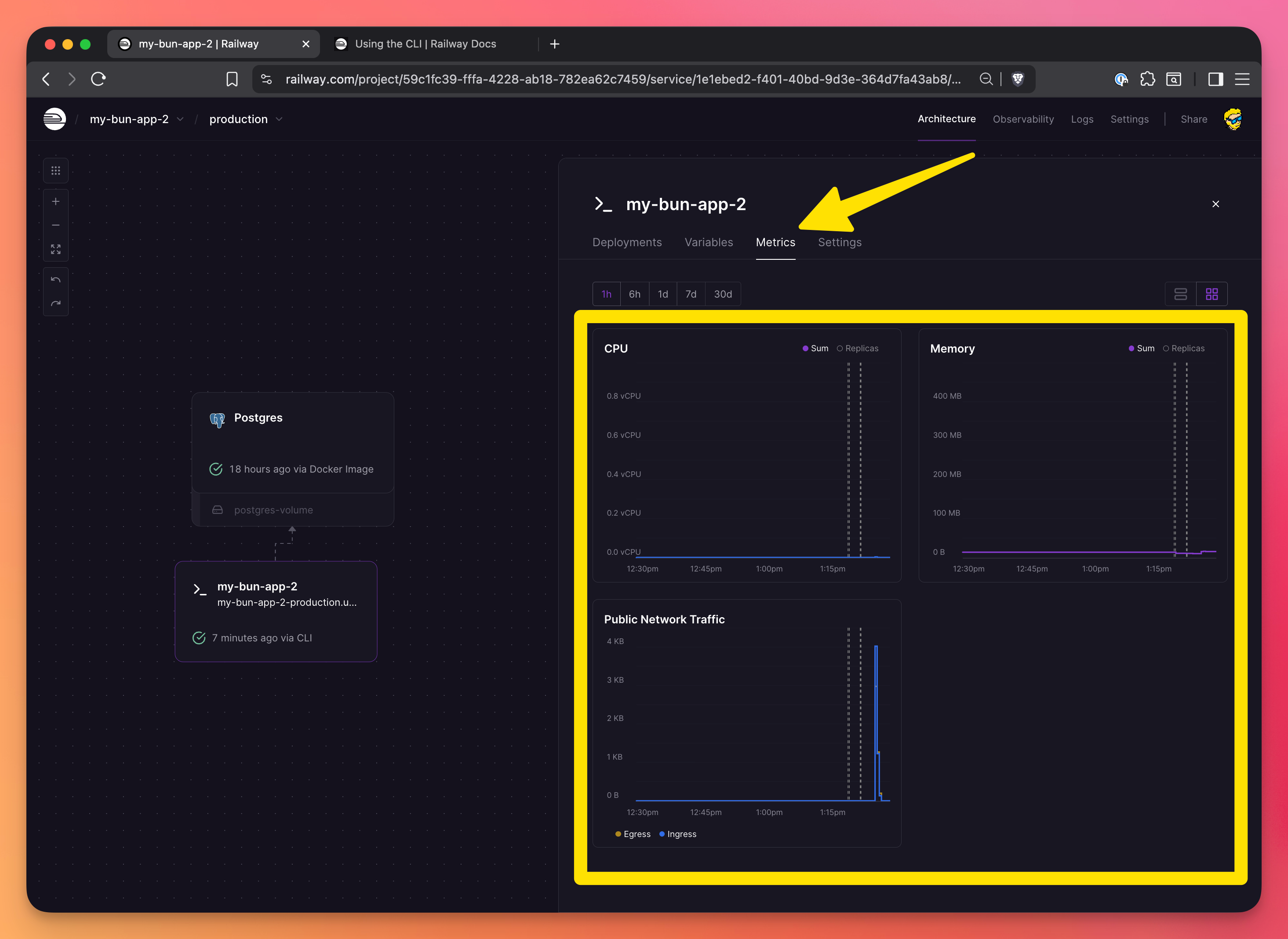 Keep an eye on your usage metrics dashboard to avoid surprises. Railway sends you alerts when you’re approaching your limits. You can see CPU/Memory/Network metrics per-app: