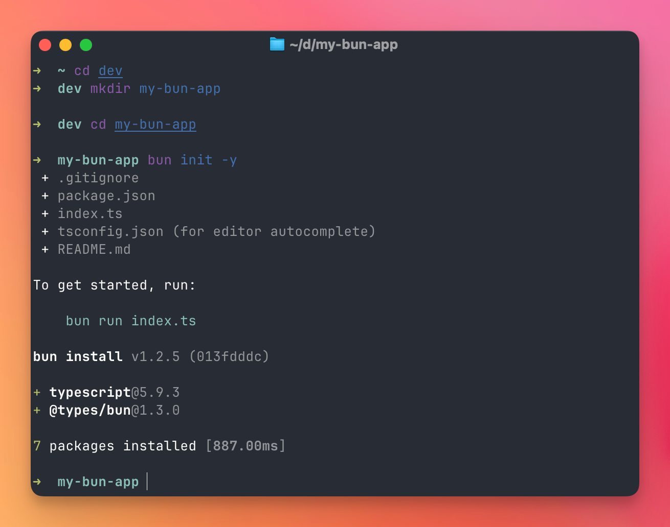 These commands initialize a Git repository, stage all files, create an initial commit, create a new public GitHub repository named “my-bun-app”, add it as a remote origin, and push the code to the main branch.